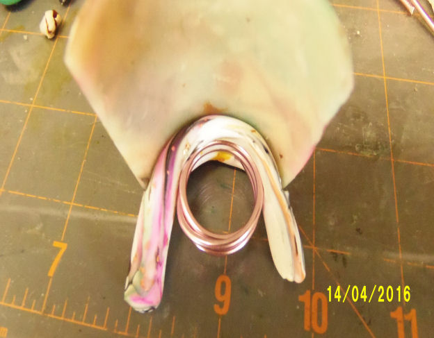 When you have it trimmed and fitted the way you want, carefully remove the ring with the polymer clay attached to it and apply your translucent liquid polymer clay medium to the space when the ring will set. I left a 1/4" inch edge at the bottom of my screen so the screen itself will set just below the bulb socket nicely. When you are satisfied with the fit and wiped any excess around the ring with a paper towel or wet wipe place it back into your pan, cover and bake at manufacturers suggestion . . . I baked at 250F degrees for 35-40 minutes and checked to make sure the liquid went transparent, turned the oven off and let the piece totally cool down.